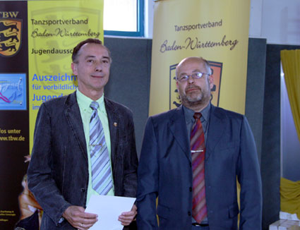Beim Verbandstag des Tanzsportverbandes Baden-Württemberg (TBW) wurde der Vorsitzende des TSC „Royal“ Heilbronn, Gerold Hornung, für seine langjährige Verbandstätigkeit mit der TBW-Verdienstnadel in Bronze ausgezeichnet (siehe auch unter Presse -Bericht vom Verbandstag). Das Bild zeigt den Geehrten neben Vizepräsident Klaus Theimer. |